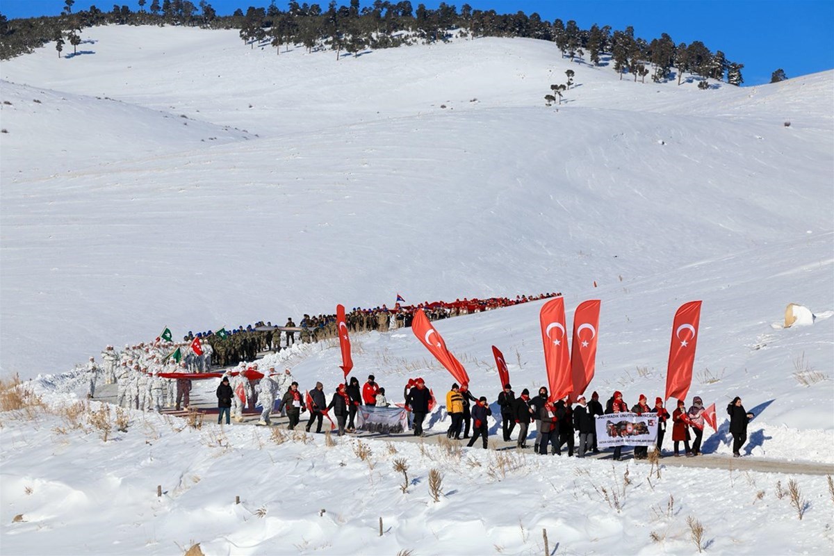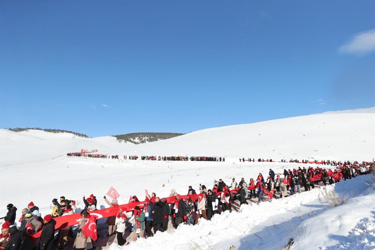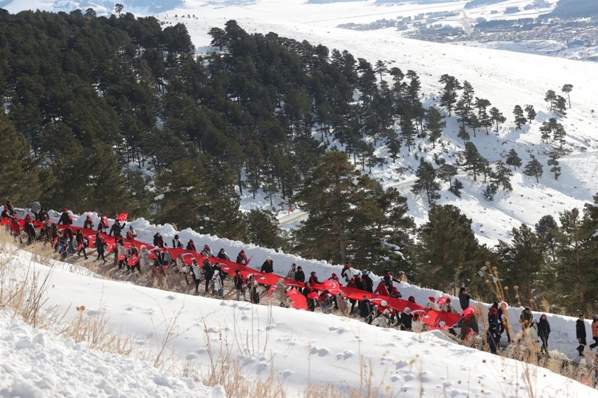 Kent merkeziyle Sarıkamış ilçesinden otobüslerle zirveye ulaşan katılımcılar, Türk bayraklarıyla yürüyerek toplanma alanına geldi. Vatandaşlar, Kızılçubuk bölgesinde şehitler anısına yapılan kardan heykellerin önünde fotoğraf çektirdi.