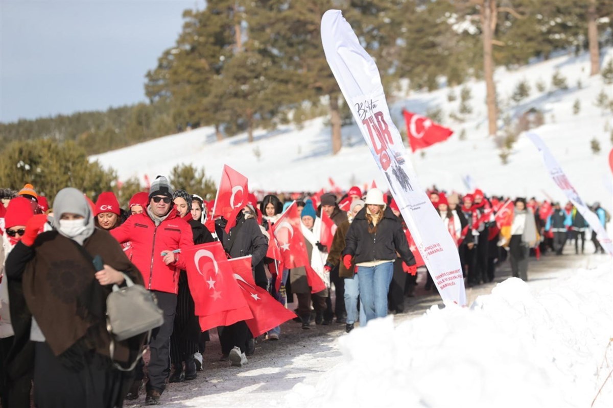 Ellerinde Türk bayrakları bulunan binlerce kişi, burada Kur'an-ı Kerim okuyup tekbir ve salavatlar getirerek şehitler için dua ettikten sonra soğuk havada Ay-Yıldızlı Tören Alanı'na doğru yürüyüşe geçti.